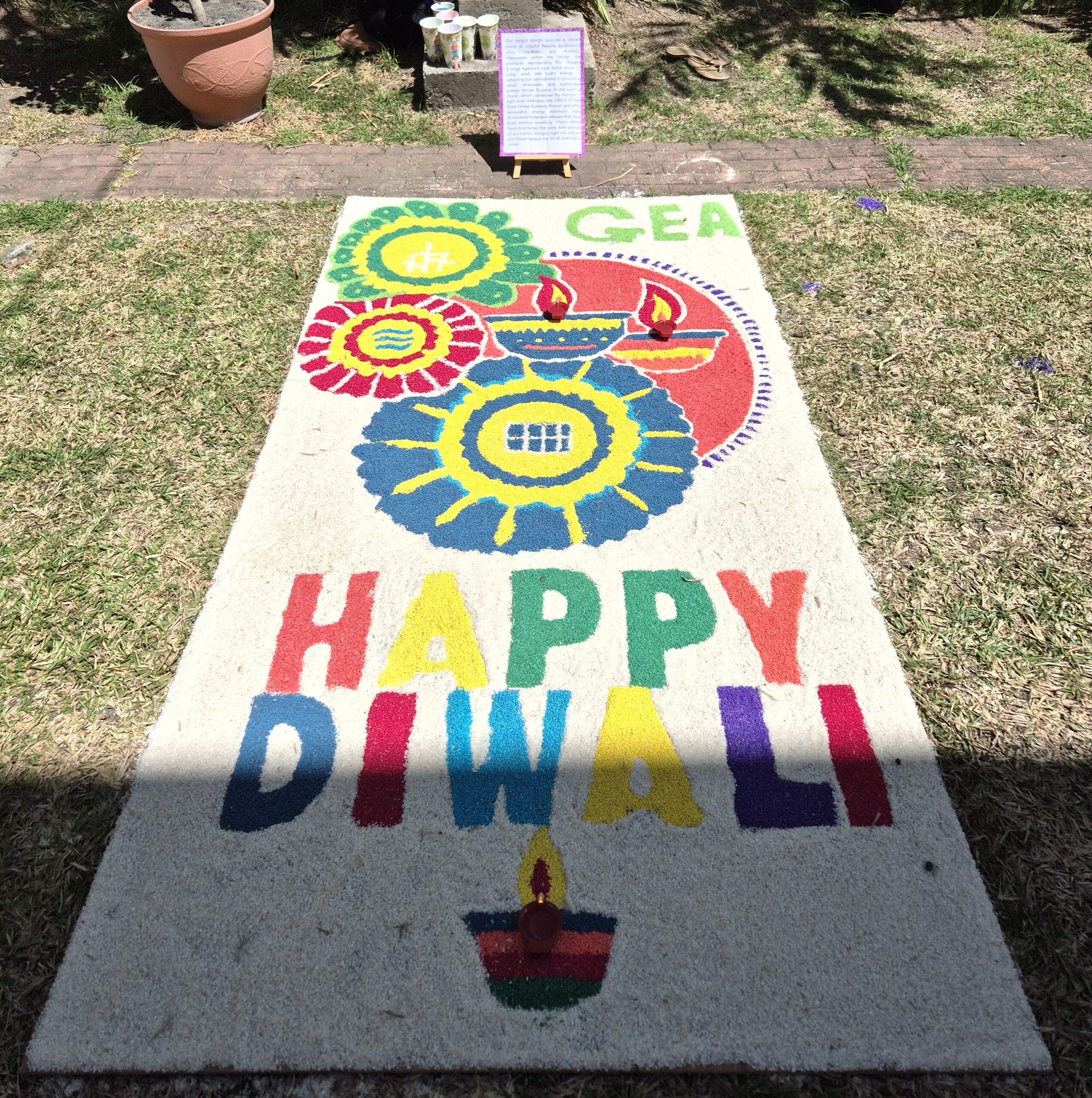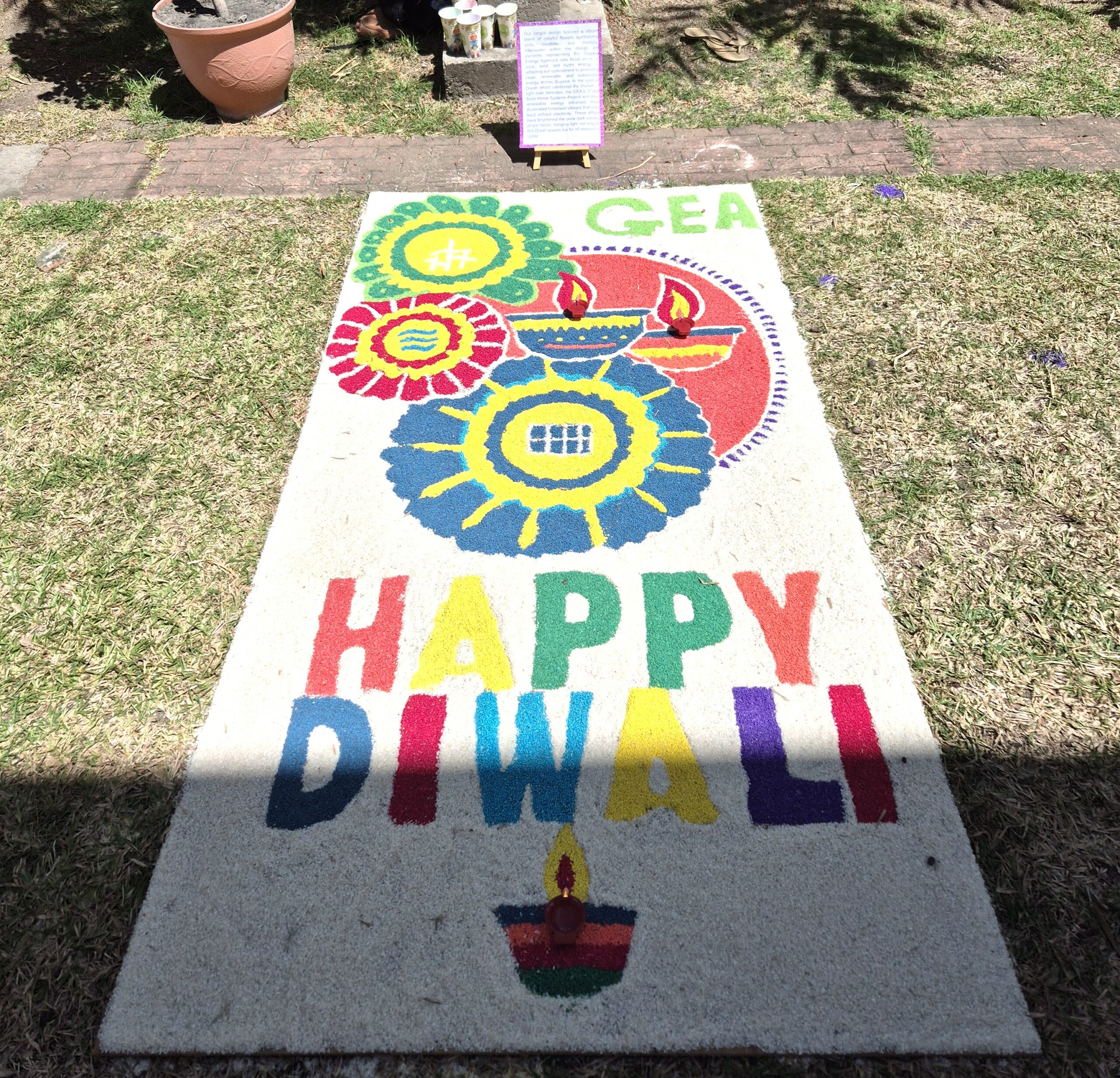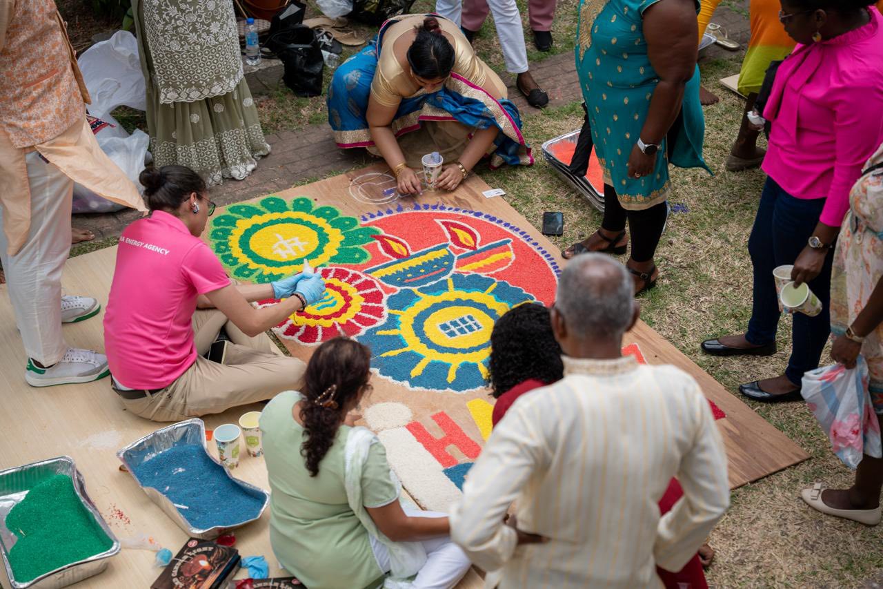 The GEA’s rangoli beautifully combined vibrant colours, creativity, and elements of the Agency’s core focus areas in renewable energy – solar, wind, and hydro, as well as elements of Diwali to bring the rangoli design to life, in celebration of the Festival of Lights.