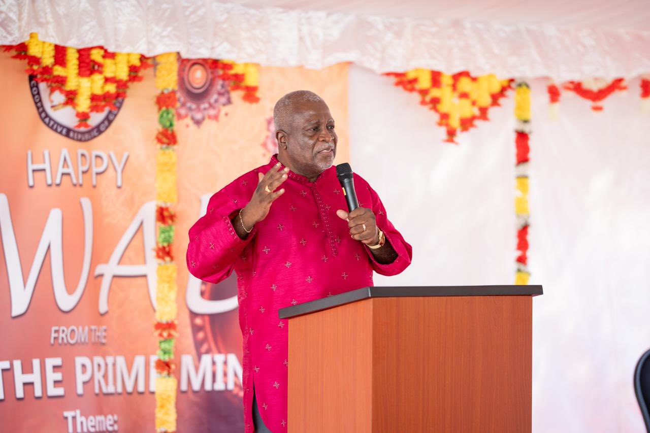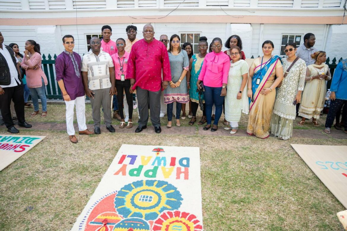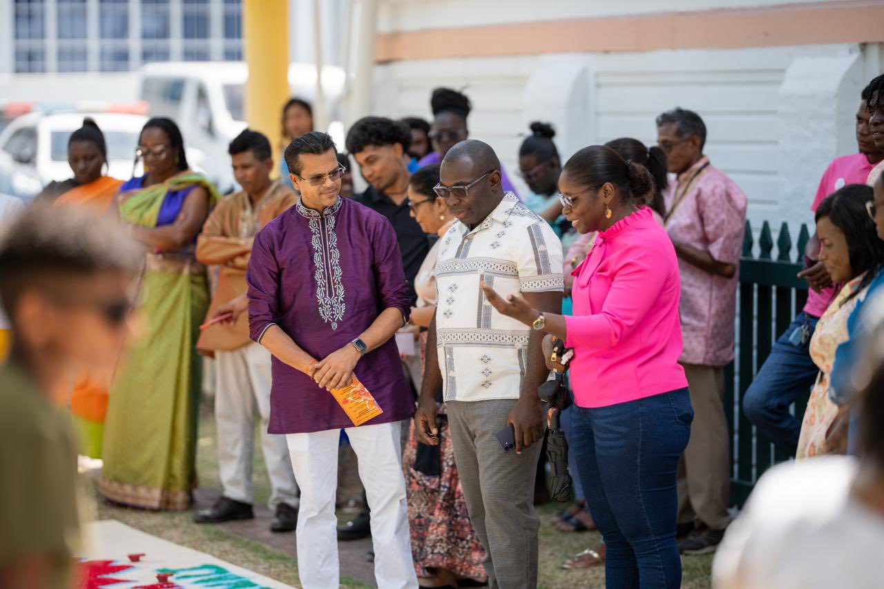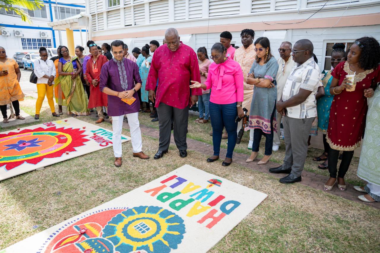 Sub Diwali 🪔 | Prime Minister, Brigadier (Retired), the Honourable Mark Phillips (centre), Minister within the Office of the Prime Minister with responsibility for Public Affairs, the Honourable Kwame McCoy, along with CEO of the Guyana Energy Agency, Dr Mahender Sharma and the GEA team at the pre-Diwali celebrations and Rangoli Competition hosted on Friday at OPM.