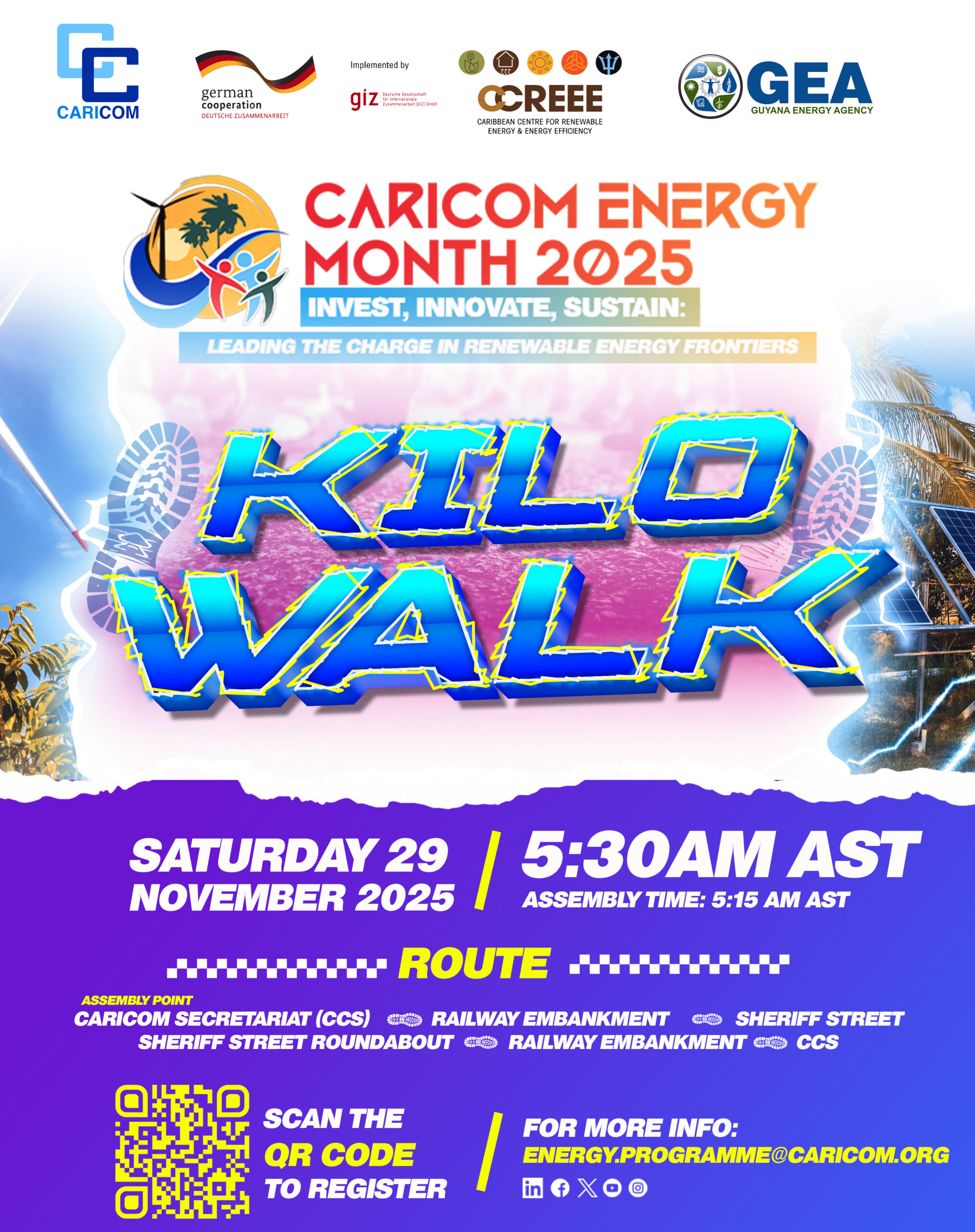 Georgetown, November 13, 2025 – The CARICOM Energy Month (CEM) 2025 Regional Kilo Walk is set to be held on Saturday, November 29, 2025, starting from 5:30 a.m. AST.